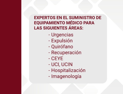 EXPERTOS EN EL SUMINISTRO DE EQUIPAMIENTO MÉDICO PARA LAS SIGUIENTES ÁREAS: - Urgencias - Expulsión - Quirófano - Recuperación - CEYE - UCI, UCIN - Hospitalización - Imagenología