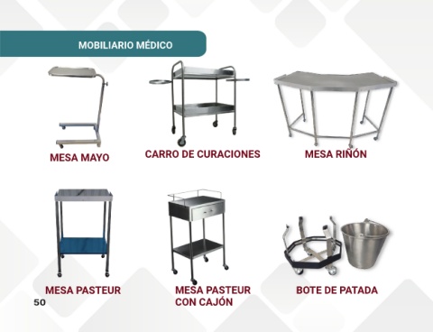 MOBILIARIO MÉDICO MESA MAYO CARRO DE CURACIONES MESA RIÑÓN MESA PASTEUR MESA PASTEUR BOTE DE PATADA 50 CON CAJÓN