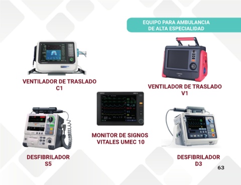 EQUIPO PARA AMBULANCIA DE ALTA ESPECIALIDAD VENTILADOR DE TRASLADO C1 VENTILADOR DE TRASLADO V1 MONITOR DE SIGNOS VITALES UMEC 10 DESFIBRILADOR DESFIBRILADOR S5 D3 63
