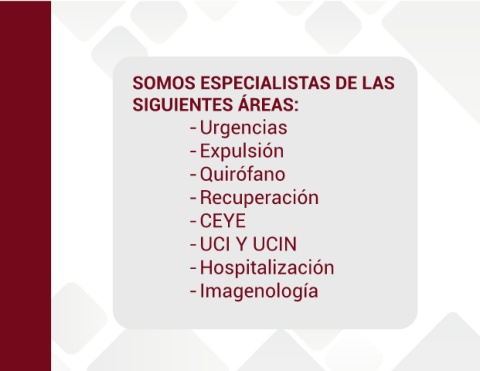 SOMOS ESPECIALISTAS DE LAS SIGUIENTES ÁREAS: -Urgencias -Expulsión -Quirófano -Recuperación -CEYE -UCI Y UCIN -Hospitalización -Imagenología